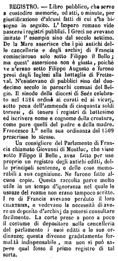 | Registro - Libro pubblico, che serve a custodire memorie, od atti, o minute, per giustificazione d'alcuni fatti di cui s'ha bisogno in seguito. L'Impero romano vide nascere i registri pubblici. I Greci ne avevano imitato l'esempio sino dal secolo settimo. De la Mare asserisce che i più antichi delle cancellerie e degli archivj di Francia cominciarono solo sotto Filippo il Bello; ma quest'assersione non è giusta, poichè ve n'erano sotto Filippo Augusto e furono presi dagli Inglesi alla battaglia di Fretteval. N'esistevano di pubblici sino dal duodecimo secolo in parecchi comuni del Belgio. Il sinodo della diocesi di Seéz celebrato nel 1524 ordinò ai curati ed ai vicarj, sotto pena dell'ammenda di cinquanta soldi tornesi, di tenere i registri di battesimo ed iscrivere nome e cognome della creatura, come pure quelli del padre e della madre. Francesco I.° nella sua ordinanza del 1509 prescrisse lo stesso.