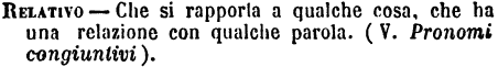 | Relativo - Che si rapporta a qualche cosa, che ha una relazione con qualche parola. (V. Pronomi congiuntivi). [immagine] |