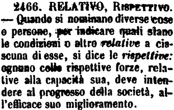 | Relativo, Rispettivo - Quando si nominano diverse cose e persone, per indicare quali siano le condizioni o altro relative a ciascuna di esse, si dice le rispettive: ognuno colle rispettive forze, relative alla capacità sua, deve intendere al progresso della società, all'efficace suo miglioramento. [immagine] |