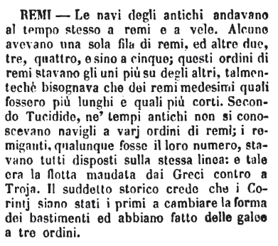 Remi - Le navi degli antichi andavano al tempo stesso a remi e a vele. Alcune avevano una sola fila di remi, ed altre due, tre, quattro, e sino a cinque; questi ordini di remi stavano gli uni più su degli altri, talmentechè bisognava che dei remi medesimi quali fossero più lunghi e quali più corti. Secondo Tucidide, ne' tempi antichi non si conoscevano navigli a varj ordini di remi; i remiganti, qualunque fosse il loro numero, stavano tutti disposti sulla stessa linea: e tale era la flotta mandata dai Greci contro a Troja. Il suddetto storico crede che i Corintj siano stati i primi a cambiare la forma dei bastimenti ed abbiano fatto delle galee a tre ordini. [immagine]