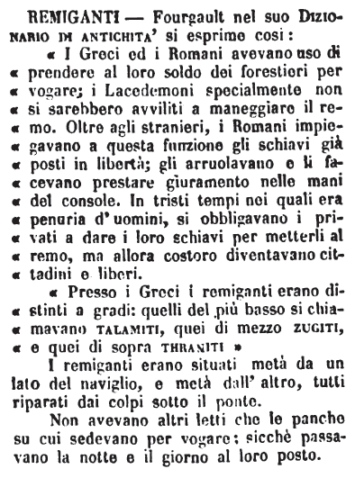 «I Greci ed i Romani avevano uso di prendere al loro soldo dei forestieri per vogare; i Lacedemoni specialmente non si sarebbero avviliti a maneggiare il remo. Oltre agli stranieri, i Romani impiegavano a questa funzione gli schiavi già posti in libertà; gli arruolavano e li facevano prestare giuramento nelle mani del console. In tristi tempi nei quali era penuria d’uomini, si obbligavano i privati a dare i loro schiavi per metterli al remo, ma allora costoro diventavano cittadini e liberi. Presso i Greci i remiganti erano distinti a gradi: quelli del più basso si chiamavano talamiti, quei di mezzo zugiti, e quei di sopra thraniti» I remiganti erano situati metà da un lato del naviglio, e metà dall’altro, tutti riparati dai colpi sotto il ponte. Non avevano altri letti che le panche su cui sedevano per vogare; sicchè passavano la notte e il giorno al loro posto. [immagine] |