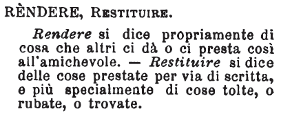 | Rendere, Restituire - Rendere si dice propriamente di cosa che altri ci dà o ci presta così all'amichevole. - Restituire si dice delle cose prestate per via di scritta, e più specialmente di cose tolte, o rubate, o trovate. [immagine] |