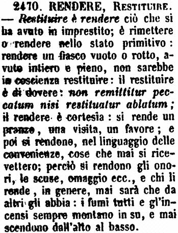 | Rendere, Restituire - Restituire è rendere ciò che si ha avuto in imprestito; è rimettere o rendere nello stato primitivo: rendere un fiasco vuoto o rotto, avuto intiero e pieno, non sarebbe in coscienza restituire: il restituire è di dovere: non remittitur peccatum nisi restituatur ablatum; il rendere è cortesia: si rende un pranzo, una visita, un favore; e poi si rendono, nel linguaggio delle convenienze, cose che mai si ricevettero; perciò si rendono gli onori, le scuse, omaggio ecc., e chi li rende, in genere, mai sarà che da altri gli abbia: i fumi tutti e gl'incensi sempre montano in su, e mai scendono dall'alto al basso. [immagine] |
