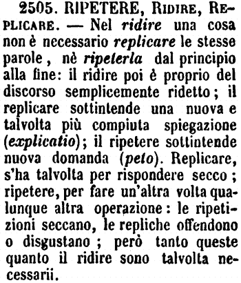 | Replicare, Ripetere - Nel primitivo suo significato Ripetere è Domandare un'altra volta. Ancora, Ripetere, in linguaggio curiale, vale Domandare il suo, e Replicare, Rispondere. Nel comune discorso, Ripetere è Tornare a dire una cosa già detta, e Replicare è Tornare a fare. Posto assolutamente, Replicare vale Contraddire, opporsi con parole, rimostrare, ridire insistendo, significati che Ripetere non ha. [immagine] |