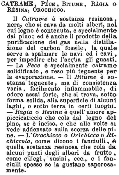| Catrame, Pece, Bitume, Ragia o Resina, Orochicco - Il Catrame è sostanza resinosa, nera, che si cava da molti alberi, nel cui legno è contenuta, e specialmente dal pino; ed è anche il prodotto della purificazione del gas nella distillazione del carbon fossile, la quale serve a spalmare le navi ed i cavi, per impedire che l’acqua gli guasti. - La Pece è specialmente catrame solidificato, e reso più tegnente per la evaporazione. – Il Bitume è sostanza tegnente, ma di consistenza varia, facilmente infiammabile, di odore assai forte, che si trova, sotto forma solida, alla superficie di alcuni laghi, o sotto terra in certi luoghi. – Ragia o Resina è quell’umore appiccicaticcio che cola dal legno del pino, se è inciso, e che alle volte si vede addensato sulla scorza delle pine. – L’ Orochicco o Orichicco o Richiccolo, come dicono i fanciulli, è quella sostanza resinosa che cola da alcuni punti degli alberi da frutto, come ciliegi, susini, ecc., e i fanciulli spesso se la gustano saporosamente. [immagine] |