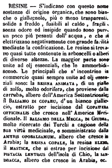 | Resine - S'indicano con questo nome sostanze di origine organica, che sono bianche o giallognole, più o meno trasparenti, solide a freddo, fusibili al caldo, fragili, senza odore ed insipide quando sono pure, un poco più pesanti dell'acqua, e che si elettrizzano negativamente con grande facilità mediante la confricazione. Le resine si trovano quasi tutte contenute in arboscelli o alberi di diverse altezze. La maggior parte sono unite ad olj essenziali, che le ammorbidiscono. Le principali che s'incontrino in commercio quasi sempre unite ad olj essenziali sono: la resina animata, di un giallo di zolfo, molto odorifera, che proviene dalla carruba, albero dell'America Settentrionale; il Balsamo di copahu, d'un bianco gialliccio, estratto per incisione dal copaifera officinalis che cresce nell'America Meridionale. Il balsamo della Mecca, di Giudea, molto ricercato dai Turchi a cagione della sua virtù medicinale, e somministrato dalla amyris opobalsamum, albero che cresce in Arabia; la resina copale, la resina elemi, il mastice, che si estrae per incisione dal pistacia lentisus dell'isola di Chio, la sandracca, albero che cresce in Arabia, ec. [immagine] |