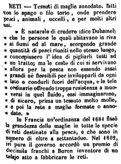 «E' naturale di credere (dice Duhamel) che le persone le quali abitavano in riva ai fiumi ad al mare, scorgendo grande quantità di pesci riuniti nello stesso luogo, concepissero l'idea di pigliarli tutti ad un tratto; ma le ceste di cui si servivano allora per la pesca non essendo assai grandi nè flessibili per invilupparli da ogni lato e condurli fuori dell'acqua, e le tele ordinarie offrendo troppa resistenza a muoversi in quel fluido, essi immaginarono, di sicuro, prima un tessuto molto molle, e poi la rete a maglie fermate o annodate.» In Francia un'ordinanza del 1681 fissò la grandezza delle maglie in tutte le specie di reti destinate alla pesca, e che sono in numero di oltre a settantadue. Nel 1802, ivi pure il governo accordò un premio di diecimila franchi a Buron inventore di un telajo atto a fabbricare le reti. [immagine] |
