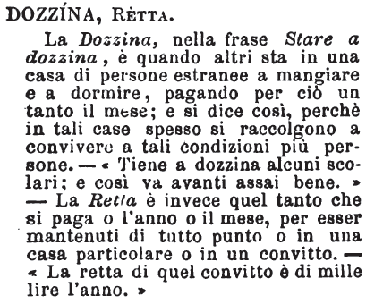 | Dozzina, Retta - La Dozzina, nella frase Stare a dozzina, è quando altri sta in una casa di persone estranee a mangiare e a dormire, pagando per ciò un tanto il mese; e si dice così, perchè in tali case spesso si raccolgono a convivere a tali condizioni più persone. - « Tiene a dozzina alcuni scolari; e così va avanti assai bene. » - La Retta è invece quel tanto che si paga o l'anno o il mese, per esser mantenuti di tutto punto o in una casa particolare o in un convitto. - « La retta di quel convitto è di mille lire l'anno. » [immagine] |