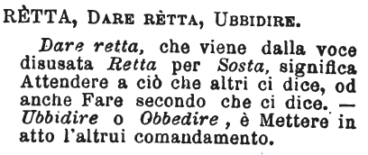 | Retta, Dare retta, Ubbidire - Dare retta, che viene dalla voce disusata Retta per Sosta, significa Attendere a ciò che altri ci dice, od anche Fare secondo che ci dice. - Ubbidire o Obbedire, è Mettere in atto l'altrui comandamento. [immagine] |