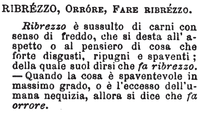 | Ribrezzo, Orrore, Fare ribrezzo - Ribrezzo è sussulto di carni con senso di freddo, che si desta all'aspetto o al pensiero di cosa che forte disgusti, ripugni e spaventi; della quale suol dirsi che fa ribrezzo. - Quando la cosa è spaventevole in massimo grado, o è l'eccesso dell'umana nequizia, allora si dice che fa orrore. [immagine] |