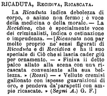 | Ricaduta, Recidiva, Ricascata - La Ricaduta indica debolezza di corpo, o animo non fermo; è voce della medicina o della morale. - La Recidiva, che è specialmente voce dei criminalisti, indica o ostinazione o imprudenza. - [Ricascata non par molto proprio ne' sensi figurati di Ricaduta e di Recidiva e ha il suo speciale di Ciò che si lascia cader giù per ornamento. - «Finiva il detto palco allato alla scena con una ricascata conveniente alla sua bellezza.» (Rossi) - «Velluto cremisi gallonato con ispesse guarnizioni di oro, e pendeva da' parapetti con ampie ricascate.» (Segni A.) G. F.] [immagine] |