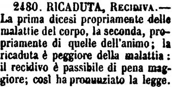 | Ricaduta, Recidiva - La prima dicesi propriamente delle malattie del corpo, la seconda, propriamente di quelle dell'animo; la ricaduta è peggiore della malattia; il recidivo è passibile di pena maggiore; così ha pronunziato la legge. [immagine] |