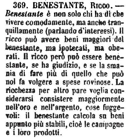 | Benestante, Ricco - Benestante è non solo chi ha di che vivere comodamente, ma anche tranquillamente (parlando d'interessi). Il ricco può avere beni maggiori del benestante, ma ipotecati, ma oberati. Il ricco però può essere benestante, se ha giudizio, e se la smania di fare più di quello che può nol fa volgere a spese rovinose. La ricchezza per altro pare voglia considerarsi consistere maggiormente nell'oro e nell'argento, cose fuggevoli: il benestante calcola su beni appunto più stabili, cioè le campagne e i loro prodotti. [immagine] |