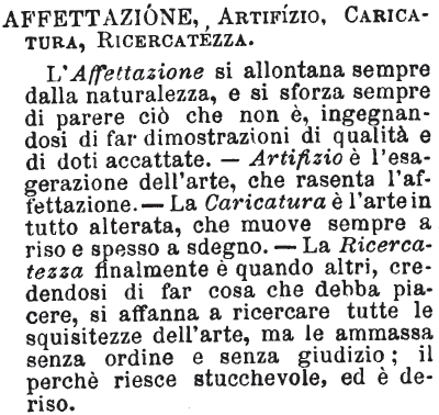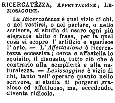 | Ricercatezza, Affettazione, Leziosaggine - La Ricercatezza è quel vizio di chi, o nel vestirsi, o nel parlare, o nello scrivere, si studia di usare ogni più elegante abito o frase, per la qual cosa si scopre l'artifizio e sparisce l'arte. - L'Affettazione è ricercatezza eccessiva; cerca e affastella lo squisito, il disusato, tutto ciò che è contrario alla semplicità e alla naturalezza. - Leziosaggine è vizio di chi, tanto nell'operare quanto nello scrivere, si studia di porgersi grazioso ed affettuoso, ma, eccedendo, diventa ridicolo. [immagine] |