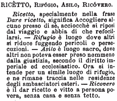 | Ricetto, Rifugio, Asilo, Ricovero - Ricetto, specialmente nella frase Dare ricetto, significa Accogliere alcuno presso di sè, acciocchè si riposi dal viaggio e abbia di che refocillarsi. - Rifugio è luogo dove altri si riduce fuggendo pericoli o persecuzioni. - Asilo è luogo sacro, dove altri non poteva esser preso nemmeno dalla giustizia, secondo il diritto imperiale ed acclesiastico. Ora si intende per un simile luogo di rifugio, e ne rimane traccia nelle residenze degli ambasciatori esteri. - Ricovero è il dar ricetto e vitto a persona povera, senza casa e senza tetto. [immagine] |