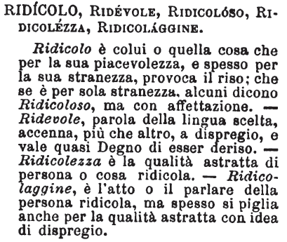 | Ridicolo, Ridevole, Ridicoloso, Ridicolezza, Ridicolaggine - Ridicolo è colui o quella cosa che per la sua piacevolezza, e spesso per la sua stranezza, provoca il riso; che se è per sola stranezza, alcuni dicono Ridicoloso, ma con affettazione. - Ridevole, parola della lingua scelta, accenna, più che altro, a dispregio, e vale quasi Degno di esser deriso. - Ridicolezza è la qualità astratta di persona o cosa ridicola. - Ridicolaggine, è l'atto o il parlare della persona ridicola, ma spesso si piglia anche per la qualità astratta con idea di dispregio. [immagine] |
