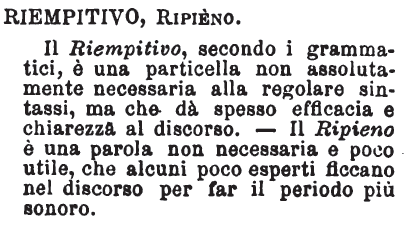 | Riempitivo, Ripieno - Il Riempitivo, secondo i grammatici, è una particella non assolutamente necessaria alla regolare sintassi, ma che dà spesso efficacia e chiarezza al discorso. - Il Ripieno è una parola non necessaria e poco utile, che alcuni poco esperti ficcano nel discorso per far il periodo più sonoro. [immagine] |