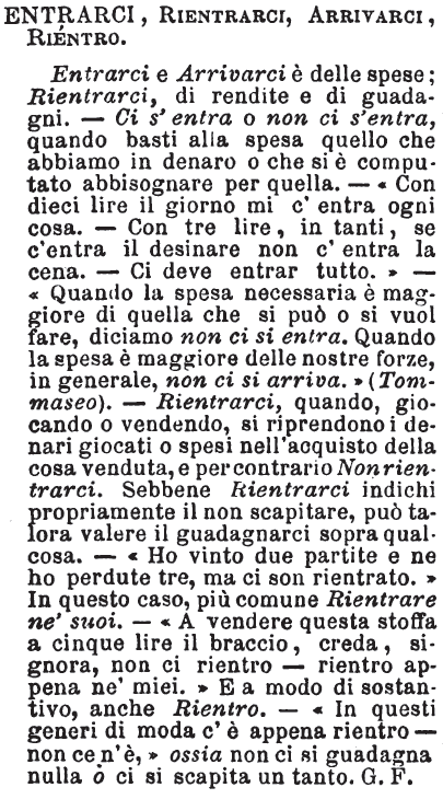 | Entrarci, Rientrarci, Arrivarci, Rientro - Entrarci e Arrivarci è delle spese; Rientrarci, di rendite e di guadagni. - Ci s'entra o non ci s'entra, quando basti alla spesa quello che abbiamo in denaro o che si è computato abbisognare per quella. - « Con dieci lire il giorno mi c'entra ogni cosa. - Con tre lire, in tanti, se c'entra il desinare non c'entra la cena. - Ci deve entrar tutto. » - « Quando la spesa necessaria è maggiore di quella che si può o si vuol fare, diciamo non ci si entra. Quando la spesa è maggiore delle nostre forze, in generale, non ci si arriva.» (Tommaseo). - Rientrarci, quando, giocando o vendendo, si riprendono i denari giocati o spesi nell'acquisto della cosa venduta, e per contrario Non rientrarci. Sebbene Rientrarci indichi propriamente il non scapitare, può talora valere il guadagnarci sopra qualcosa. - « Ho vinto due partite e ne ho perdute tre, ma ci son rientrato. » In questo caso, più comune Rientrare ne' suoi. - « A vendere questa stoffa a cinque lire il braccio, creda, signora, non ci rientro - rientro appena ne' miei. » E a modo di sostantivo, anche Rientro. - « In questi generi di moda c'è appena rientro - non ce n'è, » ossia non ci si guadagna nulla o ci si scapita un tanto. G. F. [immagine] |