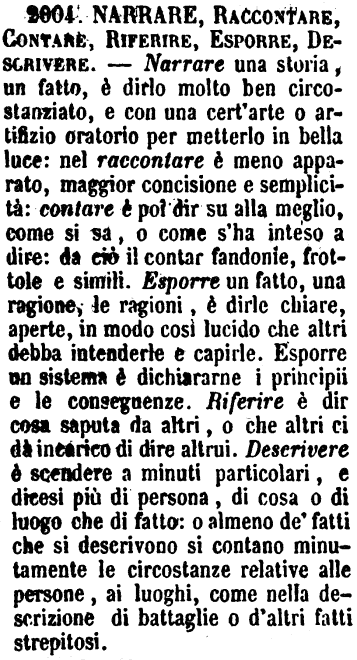 | Narrare, Raccontare, Contare, Riferire, Esporre, Descrivere - Narrare una storia, un fatto, è dirlo molto ben circostanziato, e con una cert'arte o artifizio oratorio per metterlo in bella luce: nel raccontare è meno apparato, maggior concisione e semplicità: contare è poi dir su alla meglio, come si sa, o come s'ha inteso a dire: da ciò il contar fandonie, frottole e simili. Esporre un fatto, una ragione, le ragioni, è dirle chiare, aperte, in modo così lucido che altri debba intenderle e capirle. Esporre un sistema è dichiararne i principii e le conseguenze. Riferire è dir cosa saputa da altri, o che altri ci dà incarico di dire altrui. Descrivere è scendere a minuti particolari, e dicesi più di persona, di cosa o di luogo che di fatto: o almeno de' fatti che si descrivono si contano minutamente le circostanze relative alle persone, ai luoghi, come nella descrizione di battaglie o d'altri fatti strepitosi. [immagine] |