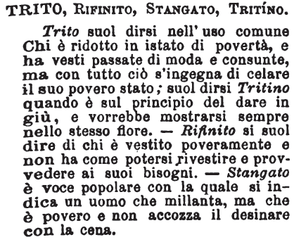 | Trito, Rifinito, Stangato, Tritino - Trito suol dirsi nell'uso comune Chi è ridotto in istato di povertà, e ha vesti passate di moda e consunte, ma con tutto ciò s'ingegna di celare il suo povero stato; suol dirsi Tritino quando è sul principio del dare in giù, e vorrebbe mostrarsi sempre nello stesso fiore. - Rifinito si suol dire di chi è vestito poveramente e non ha come potersi rivestire e provvedere ai suoi bisogni. - Stangato è voce popolare con la quale si indica un uomo che millanta, ma che è povero e non accozza il desinare con la cena. [immagine] |