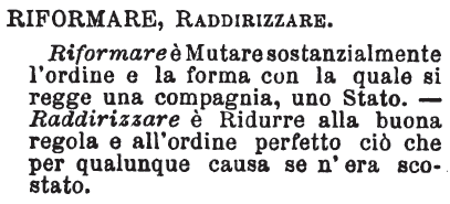 | Riformare, Raddirizzare - Riformare è Mutare sostanzialmente l'ordine e la forma con la quale si regge una compagnia, uno Stato. - Raddirizzare è Ridurre alla buona regola e all'ordine perfetto ciò che per qualunque causa se n'era scostato. [immagine] |