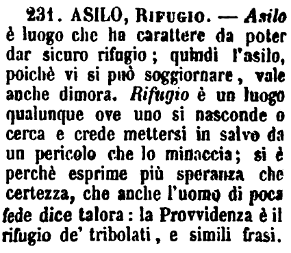 | Asilo, Rifugio - Asilo è luogo che ha carattere da poter dar sicuro rifugio; quindi l'asilo, poichè vi si può soggiornare, vale anche dimora. Rifugio è un luogo qualunque ove uno si nasconde o cerca e crede mettersi in salvo da un pericolo che lo minaccia; si è perchè esprime più speranza che certezza, che anche l'uomo di poca fede dice talora: la Provvidenza è il rifugio de' tribolati, e simili frasi. [immagine] |