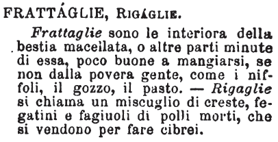 | Frattaglie, Rigaglie - Frattaglie sono le interiora della bestia macellata, o altre parti minute di essa, poco buone a mangiarsi, se non dalla povera gente, come i niffoli, il gozzo, il pasto. - Rigaglie si chiama un miscuglio di creste, fegatini e fagiuoli di polli morti, che si vendono per fare cibrei. [immagine] |