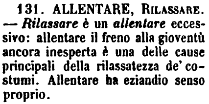 | Allentare, Rilassare - Rilassare è un allentare eccessivo: allentare il freno alla gioventù ancora inesperta è una delle cause principali della rilassatezza de' costumi. Allentare ha eziandio senso proprio. [immagine] |