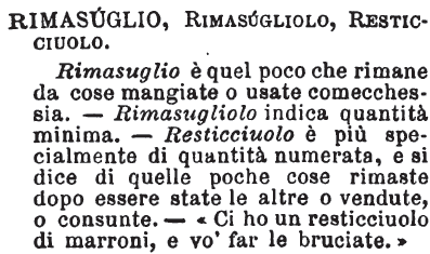 | Rimasuglio, Rimasugliolo, Resticciuolo - Rimasuglio è quel poco che rimane da cose mangiate o usate comecchessia. — Rimasugliolo indica quantità minima. — Resticciuolo è più specialmente di quantità numerata, e si dice di quelle poche cose rimaste dopo essere state le altre o vendute, o consunte. — «Ci ho un resticciuolo di marroni, e vo' far le bruciate.» [immagine] |