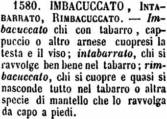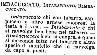 | Imbacuccato, Intabarrato, Rimbacuccato - Imbaccuccato chi con tabarro, cappuccio o altro arnese cuopresi la testa e il viso; intabarrato, chi si ravvolge ben bene nel tabarro; rimbacuccato, chi si cuopre e quasi si nasconde tutto nel tabarro o altra specie di mantello che lo ravvolga da capo a piedi. [immagine] |