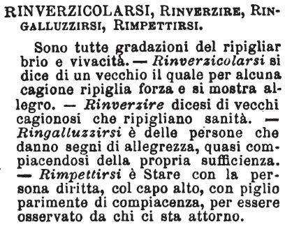 | Rinverzicolarsi, Rinverzire, Ringalluzzirsi, Rimpettirsi - Sono tutte gradazioni del ripigliar brio e vivacità. - Rinverzicolarsi si dice di un vecchio il quale per alcuna cagione ripiglia forza e si mostra allegro. - Rinverzire dicesi di vecchi cagionosi che ripigliano sanità. - Ringalluzzirsi è delle persone che danno segni di allegrezza, quasi compiacendosi della propria sufficienza. - Rimpettirsi è Stare con la persona diritta, col capo alto, con piglio parimente di compiacenza, per essere osservato da chi ci sta attorno. [immagine] |