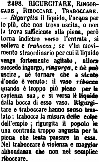 | Rigurgitare, Ringorgare, Riboccare, Traboccare - Rigurgita il liquido, l'acqua per lo più, che non trova uscita, o non la trova sufficiente alla piena, però torna indietro verso l'entrata, si solleva e trabocca; se v'ha movimento straordinario per cui il liquido venga fortemente agitato, allora succede ingorgo, ringorga, e nè può uscire, nè tornare che a stento d'onde è venuto: il vaso ribocca quando è troppo più pieno per la capienza sua, e si versa il liquido dalla bocca di esso vaso. Rigurgitare e traboccare hanno senso traslato: trabocca la misura delle colpe dell'empio; rigurgita il popolo in una contrada troppo angusta per la piena che tenta passare in essa. Nel traboccare è violenza e maggior abbondanza che non nel semplice riboccare. [immagine] |