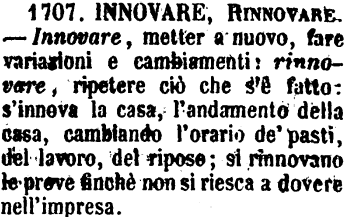| Innovare, Rinnovare - Innovare, metter a nuovo, fare variazioni e cambiamenti: rinnovare, ripetere ciò che s'è fatto: s'innova la casa, l'andamento della casa, cambiando l'orario de' pasti, del lavoro, del riposo; si rinnovano le prove finchè non si riesca a dovere nell'impresa. [immagine] |