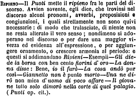 | Riempitivo, Ripieno - Il Riempitivo, secondo i grammatici, è una particella non assolutamente necessaria alla regolare sintassi, ma che dà spesso efficacia e chiarezza al discorso. - Il Ripieno è una parola non necessaria e poco utile, che alcuni poco esperti ficcano nel discorso per far il periodo più sonoro. [immagine] |