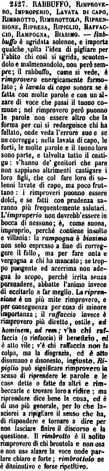 | Rabbuffo, Rimprovero, Improperio, Lavata di capo, Rimbrotto, Rimbrottolo, Riprensione, Ripresa, Ripiglio, Raffaccio, Rampogna, Biasimo - Rabbuffo è sgridata solenne, e importa qualche volta l'idea di pigliare per l'abito chi così si sgrida, scuotendolo e malmenandolo, non però sempre; il rabbuffo, come si vede, è rimprovero energicamente formolato; è lavata di capo sonora se è fatta con molte parole e con un alzare di voce che passi il tuono comune; nel rimprovero però puonno le parole non essere altro che la forma per cui si redarguisce chi ha fallato, onde veda l'errore suo e se ne corregga; nella lavata di capo, le forti, le molte parole e il tuono loro sono parte, e talvolta tutto il castigo: v'hanno de' genitori che pare non sappiano altrimenti castigare i loro figli, che col fare loro di solenni lavate di capo, ma poco fruttano: i rimproveri puonno essere dolci, e se fatti con prudenza saranno più frequentemente salutari. L'improperio non dovrebb'essere in bocca di nessuno; è, come suona, improprio, perchè contiene insulto e villania: la rampogna è biasimo non solo espresso a fine di correggere il fallo, ma per fare onta e vergogna a chi ha mancato; se troppo pungente ed acerrima non adegua lo scopo, perchè irrita senza persuadere, abbatte l'animo invece di eccitarlo a far meglio. La riprensione è un più mite rimprovero, e per conseguenza per cosa di minore importanza; il raffaccio invece è rimprovero più diretto, ostile, ad hominem, ad rem; v'ha chi raffaccia (o rinfaccia) il benefizio, ed è atto vile; v'è chi raffaccia non la colpa, ma la disgrazia, ed è atto disumano e disonesto, ingiusto. Ripiglio può significare rimprovero in senso di riprendere le parole e le cose dette o fatte da altri e rimbeccarle e trovare loro a ridire; ma riprendere dice bene la cosa, ed è di uso più generale, per lo che lascierei a ripigliare il senso che ha, di rispondere e tornare a dire per non lasciare finire il discorso e la questione. Il rimbrotto è il solito rimprovero di chi brontola e non osa o non usa alzare la voce onde parlare chiaro e forte; rimbrottolo ne è diminutivo e forse ripetitivo. [immagine] |