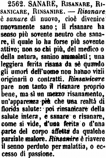 | Sanare, Risanare, Risanicare, Rinsanire - Risanare è sanare di nuovo, cioè divenire nuovamente sano; il risanare ha senso più sovente neutro che sanare, il quale lo ha forse più sovente attivo; non so chi più, del medico o della natura, sanino ammalati; una leggiera ferita risana da sè quando gli umori dell'uomo non hanno vizii originarii o contratti. Rinsanicare pare non tanto il risanare proprio bene, ma sì un mezzo risanamento, un'apparenza più che una realtà di florida salute: poi rinsanicare della salute intera, e sanare e risanare, come si vide, d'una ferita o d'una parte del corpo affetta da qualche parziale malore. Rinsanire è riavere il senno perduto per malattia, o eccesso di passione. [immagine] |