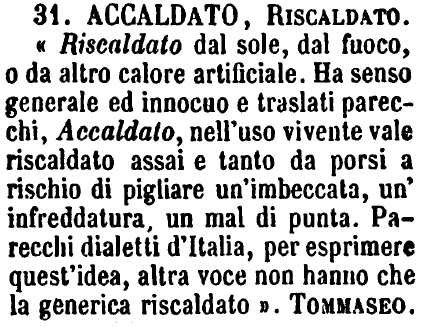 | Accaldato, Riscaldato - «Riscaldato dal sole, dal fuoco, o da altro calore artificiale. Ha senso generale ed innocuo e traslati parecchi, Accaldato, nell'uso vivente vale riscaldato assai e tanto da porsi a rischio di pigliare un'imbeccata, un'infreddatura, un mal di punta. Parecchi dialetti d'Italia, per esprimere quest'idea, altra voce non hanno che la generica riscaldato». Tommaseo. [immagine] |