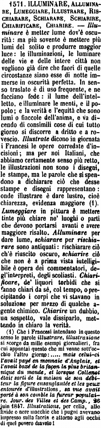 Illuminare, Alluminare, Lumeggiare, Illustrare, Rischiarare, Schiarare, Schiarire, Chiarificare, Chiarire - Illuminare è metter lume dov'è oscurità: ma più sovente è mettere più lumi del solito e produrre maggior luce: le illuminazioni, le luminare delle vie e delle intere città non vogliono già dire che fuori di quelle circostanze siano esse di notte immerse in oscurità perfetta. In senso traslato è di uso frequente, e ne facciano fede: il lume dell'intelletto, e illuminare le menti, e il popolo; e la verità e l'equità che sono lumi o fiaccole dell'anima, e va dicendo di consimili cose di cui tutto giorno si discorre a dritto e a rovescio. Illustrate dicono in giornata i Francesi le opere corredate d'incisioni; ma per noi Italiani, che abbiamo certamente senso più retto, le illustrazioni non sono i disegni, le stampe, ma le parole che si spendono a dichiarare ciò che desse stampe e disegni rappresentano: onde illustrare è dare lustro, cioè chiarezza, evidenza maggiore (1).