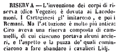 | Riserva - L'invenzione dei corpi di riserva (dice Vegezio) è dovuta ai Lacedemoni. I Cartaginesi gl'imitarono, e poi i Romani. Ma l'istituzione è molto più antica: Ciro aveva una riserva composta di cammelli, di cui ciascuno portava alcuni arcieri, e l'aspetto e la puzza de' quali cominciarono a fare sbandare i cavalieri Lidj. [immagine] |