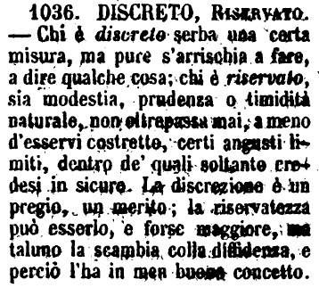 | Discreto, Riservato - Chi è discreto serba una certa misura, ma pure s'arrischia a fare, a dire qualche cosa; chi è riservato, sia modestia, prudenza o timidità naturale, non oltrepassa mai, a meno d'esservi costretto, certi angusti limiti, dentro de' quali soltanto credesi in sicuro. La discrezione è un pregio, un merito; la riservatezza può esserlo, e forse maggiore, ma taluno la scambia colla diffidenza, e perciò l'ha in men buono concetto. [immagine] |