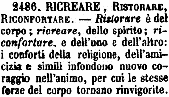 | Ricreare, Ristorare, Riconfortare - Ristorare è del corpo; ricreare, dello spirito; riconfortare, e dell'uno e dell'altro: i conforti della religione, dell'amicizia e simili infondono nuovo coraggio nell'animo, per cui le stesse forze del corpo tornano rinvigorite. [immagine] |