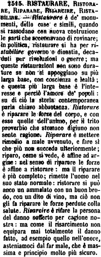 | Ristaurare, Ristorare, Riparare, Risarcire, Ristabilire - Ristaurare è de' monumenti, delle case e simili, quando si rassodano con nuova costruzione le parti che accennavano di rovinare; in politica, ristaurare si ha per ristabilire governo o dinastia, decaduti per rivoluzioni o guerre; ma queste ristaurazioni non sono durature se non si appoggiano su più larga base, con coscienza e lealtà; e questa più larga base è l'interesse e perciò l'amore de' popoli: su di ciò la storia contemporanea parla chiaro abbastanza. Ristorare è riparare le forze del corpo, e con esse quelle dell'animo, per il trito proverbio che stomaco digiuno non sente ragione. Riparare è mettere rimedio a male avvenuto, e fare sì che più non succeda ulteriormente; riparo, come si vede, è affine ad argine: nel senso di riparare le forze è affine a ristorare: ma il riparare è più completo; rimette l'uomo nel suo stato normale: ristorare si può anco un ammalato con un buon brodo, con un dito di vino, ma ciò non gli fa riparare le forze perdute colla salute. Risarcire è rifare la persona del danno sofferto per cagione nostra: ma come il risarcimento non equipara mai totalmente il danno fatto, ad esempio quello nell'onore, asteniamoci dal far male, che è massima e principio molto più sicuro. [immagine] |