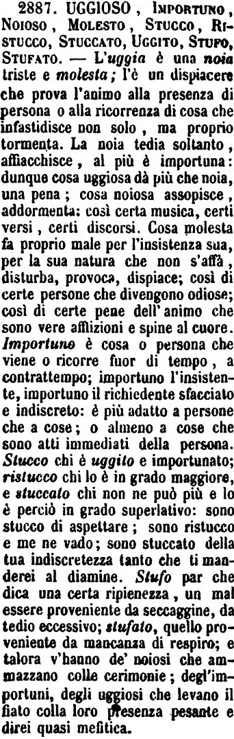 | Uggioso, Importuno, Noioso, Molesto, Stucco, Ristucco, Stuccato, Uggito, Stufo, Stufato - L'uggia è una noia triste e molesta; l'è un dispiacere che prova l'animo alla presenza di persona o alla ricorrenza di cosa che infastidisce non solo, ma proprio tormenta. La noia tedia soltanto, affiacchisce, al più è importuna: dunque cosa uggiosa dà più che noia, una pena; cosa noiosa assopisce, addormenta: così certa musica, certi versi, certi discorsi. Cosa molesta fa proprio male per l'insistenza sua, per la sua natura che non s'affà, disturba, provoca, dispiace; così di certe persone che divengono odiose; così di certe pene dell'animo che sono vere afflizioni e spine nel cuore. Importuno è cosa o persona che viene o ricorre fuor di tempo, a contrattempo; importuno l'insistente, importuno il richiedente sfacciato e indiscreto: è più adatto a persone che a cose; o almeno a cose che sono atti immediati della persona. Stucco chi è uggito e importunato; ristucco chi lo è in grado maggiore, e stuccato chi non ne può più e lo è perciò in grado superlativo: sono stucco di aspettare; sono ristucco e me ne vado; sono stuccato della tua indiscretezza tanto che ti manderei al diamine. Stufo par che dica una certa ripienezza, un mal essere proveniente da seccaggine, da tedio eccessivo; stufato, quello proveniente da mancanza di respiro; e talora v'hanno de' noiosi che ammazzano colle cerimonie; degl'importuni, degli uggiosi che levano il fiato colla loro presenza pesante e direi quasi mefitica. [immagine] |