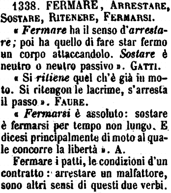 | Fermare, Arrestare, Sostare, Ritenere, Fermarsi - «Fermare ha senso d'arrestare; poi ha quello di fare star fermo un corpo attaccandolo. Sostare è neutro o neutro passivo». Gatti.