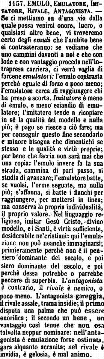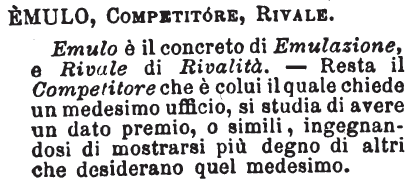 | Emulo, Competitore, Rivale - Emulo è il concreto di Emulazione, e Rivale di Rivalità. - Resta il Competitore che è colui il quale chiede un medesimo ufficio, si studia di avere un dato premio, o simili, ingegnandosi di mostrarsi più degno di altri che desiderano quel medesimo. [immagine] |