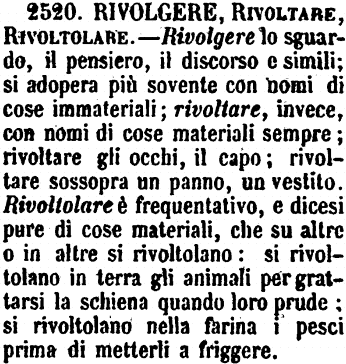 | Rivolgere, Rivoltare, Rivoltolare - Rivolgere lo sguardo, il pensiero, il discorso e simili; si adopera più sovente con nomi di cose immateriali; rivoltare, invece, con nomi di cose materiali sempre; rivoltare gli occhi, il capo; rivoltare sossopra un panno, un vestito. Rivoltolare è frequentativo, e dicesi pure di cose materiali, che su altre o in altre si rivoltolano: si rivoltolano in terra gli animali per grattarsi la schiena quando loro prude; si rivoltolano nella farina i pesci prima di metterli a friggere. [immagine] |