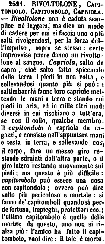 | Rivoltolone, Capitondolo, Capitombolo, Capriola - Rivoltolone non è caduta semplice nè leggera, ma dice un modo di cadere per cui si faccia uno o più salti rivolgendosi, per la forza dell'impulso, sopra se stesso: certe improvvise paure danno un rivoltolone al sangue. Capriola, salto da capro, cioè salto fatto spiccando dalla terra i piedi in una volta, e sollevandosi quanto più si può: i saltimbanchi fanno loro capriole mettendo le mani a terra e stando coi piedi in aria, ed in mille altri modi diversi in cui rischiano a tutt'ora, se non il collo, qualche membro. Il capitondolo è capriola da ragazzi, e consiste nell'appuntare mani e testa in terra, e sollevando così il corpo, fare un mezzo giro restando sdraiati dall'altra parte, o il giro intero restando nuovamente sui piedi; ma questo è più difficile: capitombolo può essere una cosa con capitondolo; ovvero può dire salto più pericoloso e mortale: si fanno de' capitomboli quando si perde fortuna, impieghi, protettori ecc.; l'ultimo capitombolo è quello della morte; da questo, uno non si rialza più: l'amico ha fatto il capitombolo, vuol dire: il tale è morto. [immagine] |