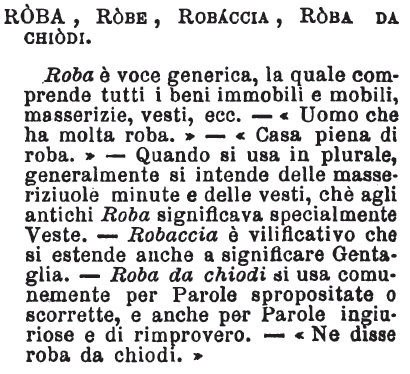 | Roba, Robe, Robaccia, Roba da chiodi - Roba è voce generica, la quale comprende tutti i beni immobili e mobili, masserizie, vesti, ecc. - «Uomo che ha molta roba.» - «Casa piena di roba.» - Quando si usa in plurale, generalmente si intende delle masseriziuole minute e delle vesti, chè agli antichi Roba significava specialmente Veste. - Robaccia è vilificativo che si estende anche a significare Gentaglia. - Roba da chiodi si usa comunemente per Parole spropositate o scorrette, e anche per Parole ingiuriose e di rimprovero. - «Ne disse roba da chiodi.» [immagine] |