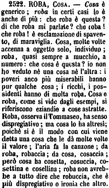 | Roba, Cosa - Cosa è generico; roba in certi casi lo è anche di più: che roba è questa? di che roba mi parlate? che roba! che roba! è esclamazione di spavento, di maraviglia. Cosa, molte volte accenna a oggetto solo, individuo; roba, quasi sempre a mucchio, a numero: che cosa è questa? io non ho veduto nè una cosa nè l'altra: i poveri anco più miserabili hanno pur qualche cosa; i ricchi, i possidenti hanno di molta roba. Cosa e roba, come si vide dagli esempi, si riferiscono eziandio a cose astratte. Roba, osserva il Tommaseo, ha senso dispregiativo; ma cosa lo ha altresì; poichè si è il modo con cui viene detta una cosa che le dà molte volte il valore; l'aria fa la canzone; da roba, robaccia; da cosa, cosaccia; però cosa ha cosetta, cosuccia, cosettina e cosellina; roba non avrebbe a tutto dire che robuccia, che è più dispregiativo o ironia che altro. [immagine] |