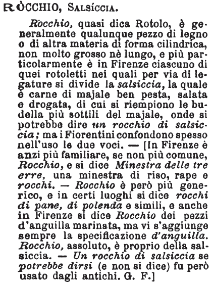 | Rocchio, Salsiccia - Rocchio, quasi dica Rotolo, è generalmente qualunque pezzo di legno o di altra materia di forma cilindrica, non molto grosso nè lungo, e più paricolarmente è in Firenze ciascuno di quei rotoletti nei quali per via di legature si divide la salsiccia, la quale è carne di majale ben pesta, salata e drogata, di cui si riempiono le budella più sottili del majale, onde si potrebbe dire un rocchio di salsiccia; ma i Fiorentini confondono spesso nell'uso le due voci. - [In Firenze è anzi più familiare, se non più comune, Rocchio, e si dice Minestra delle tre erre, una minestra di riso, rape e rocchi. - Rocchio è però più generico, e in certi luoghi si dice rocchi di pane, di polenda e simili, e anche in Firenze si dice Rocchio dei pezzi d'anguilla marinata, ma vi s'aggiunge sempre la specificazione d'anguilla. Rocchio, assoluto, è proprio della salsiccia. - Un rocchio di salsiccia se potrebbe dirsi (e non si dice) fu però usato dagli antichi. G. F.] [immagine] |